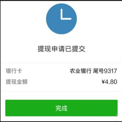 页面即转到另一页,显示“提现申请已提交”,点击“完成”;