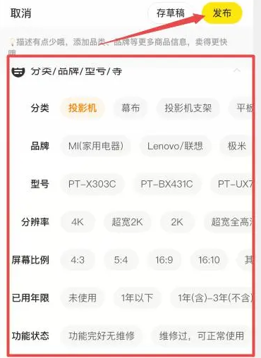 5、选择闲置物对应的品牌、型号、功能状态等属性,并设置出售价格,然后点击右上角“发布”即可。