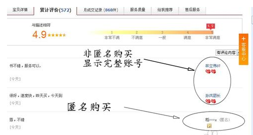 选择匿名购买了以后,卖家产品下面的购买记录里的名字是隐匿的,别人看不见,这样做的好处,就是可以更好的去避免个人隐私泄露,也可以防止别人群发广告。上面还介绍了设置的方法。