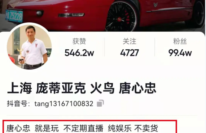 唐心忠网名叫:上海庞蒂亚克火鸟唐心忠,他主要分享的就是老洋房文化、汽车文化,正如他的抖音个人介绍:“”唐心忠,就是玩,不定期直播,纯娱乐,不卖货,汽车文化、老洋房文化、机械古董文化倡导者,拥有思南公馆和余庆路百年保护建筑老洋房,从1998年至今,买了很多车,唯独最钟爱庞蒂亚克火鸟和凯迪拉克帝威,带你走进我的情怀人生……”