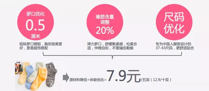 基于这三方面的微创新,袜子生产成本显著降低,商家也有底气将原先店铺售价14.95元5双,降低到7.9元5双,为产品推爆打下了价格基础。