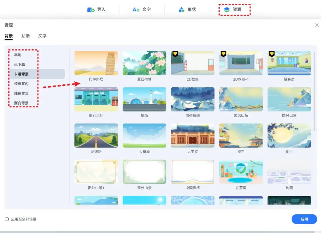 如果我们不用导入PPT的方式来创建项目,也可以自己一点一点在场景中添加素材。