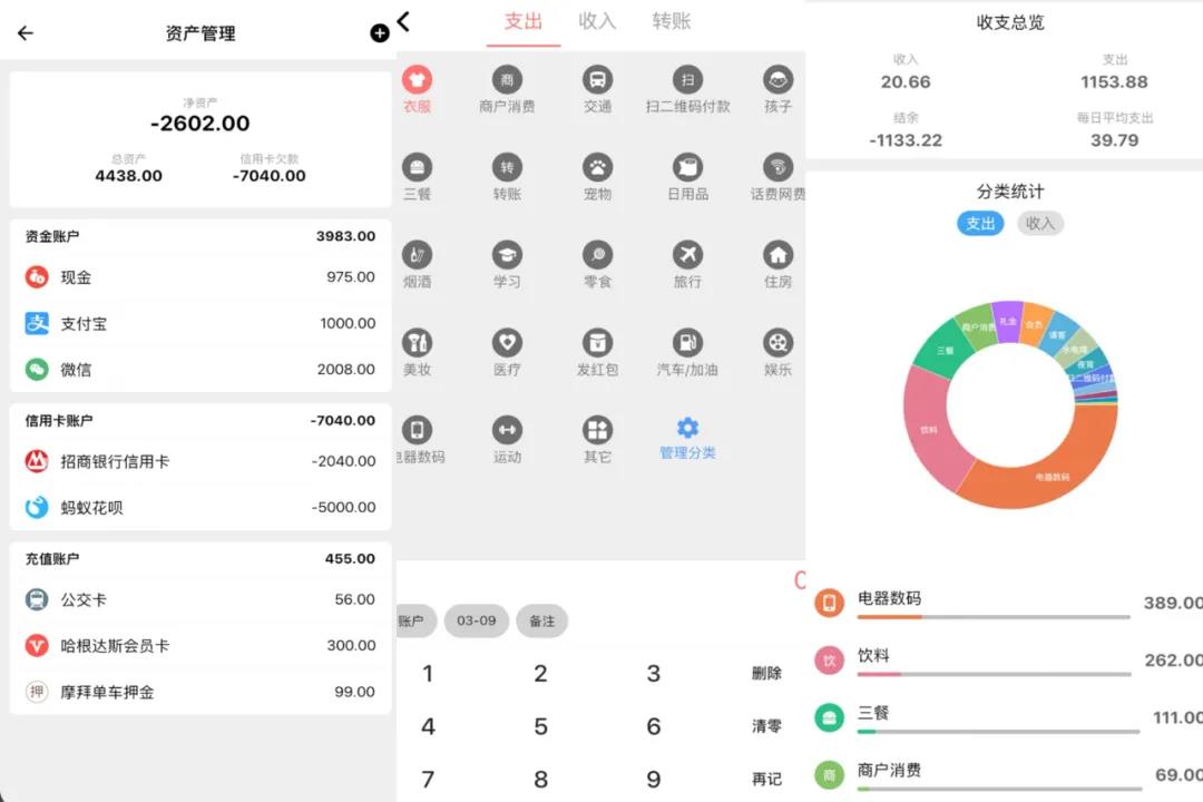 钱迹和其他的记账APP一样都有记录支出和收入的功能,特别的是他有资产管理的功能,支付宝、微信、校园卡、银行卡等等的账户都能集合在这个页面统一管理。