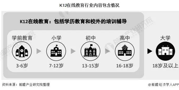 所谓的K12教育,指从小学一年级到高中三年级的教育系统,即小学、初中和高中三个阶段的基础教育。用户群体年龄范围一般为7岁-18岁。目前我国处于K12教育阶段的人口高达1.8亿,预计2020年将达到2.12亿,庞大的适龄人口基数,为K12发展奠定了基础。随着二孩政策的实施,K12适龄人口的数量将进一步增加。