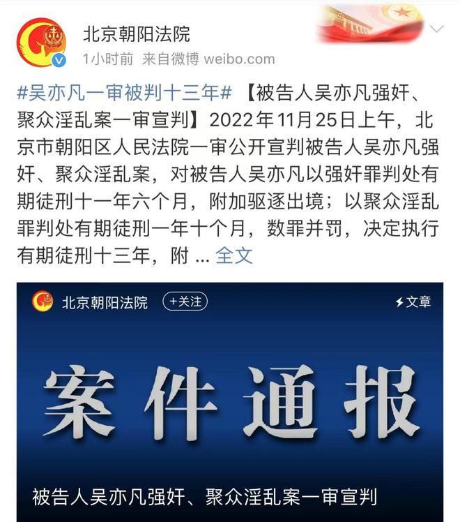 北京市朝阳区人民法院发布吴亦凡一审被判十三年的消息