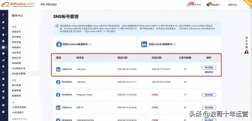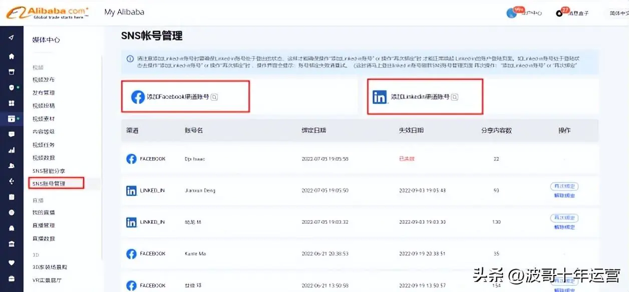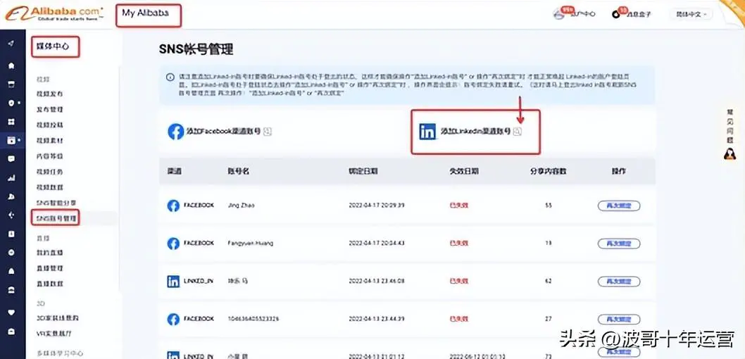 ②登录国际站后台「My Alibaba」 – 「媒体中心」 – 「SNS账号管理」,点击「添加Linkedin渠道账号」