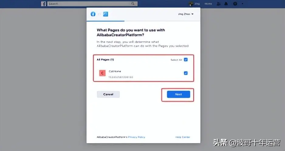 ⑤选择你的公共主页(如果没有,先登录Facebook建一个),勾选授权选项,点击确认,即绑定成功!