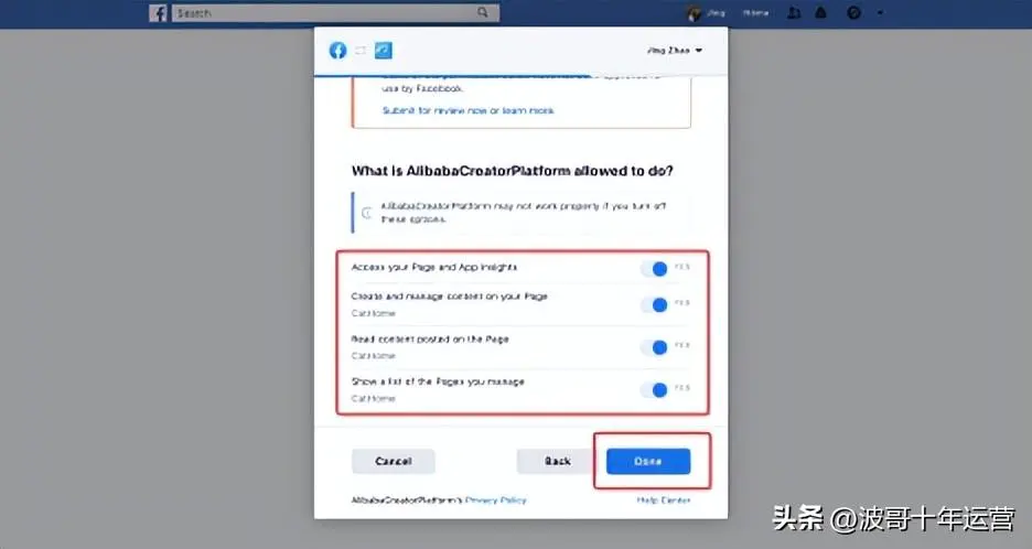 注意:以上权限需全部勾选,否则后续分享无法正常同步到FB页面