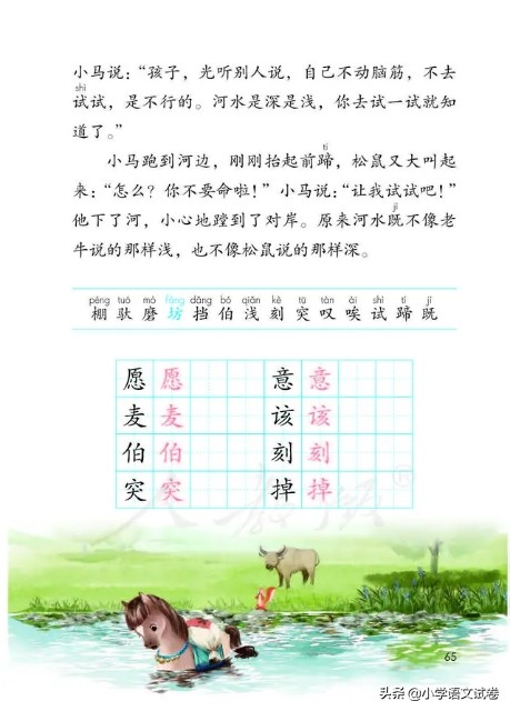 这是一篇童话故事,讲的是小马帮妈妈把半口袋麦子驮到磨坊去的时候,一条小河挡住了去路。小马去问老牛,老牛说河水很浅,而松鼠说河水深得很。妈妈叫小马试一试,小马终于跨过了河。这个故事告诉我们:别人说的是不是对的,要动脑筋思考,并亲自试一试, 才能得出正确的结论。