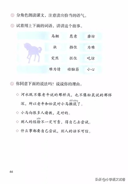 本文对话精彩,尤其是对话时的提示语鲜明地展现了人物的心理变化和性格特点。老马、小马、老牛、松鼠4个角色,说话语气符合自己的身份,且富有变化。由于对话内容不同,人物说话的语气也富于变化。“你已经长大了,能帮妈妈做点儿事吗?”妈妈是用商量、询问的语气与小马说话,显得温和、亲切。老牛和松鼠说话也富有个性特点。牛伯伯是一位长者,见多识广。说话语气十分肯定。松鼠因为亲眼见到自已的同伴淹死在河里,所以他十分焦急,说话时大喊大叫。这些语句都是分角色朗读的好材料。课文角色主要围绕“河水的深浅”展开对话,通过对话推动故事情节发展,揭示事理。