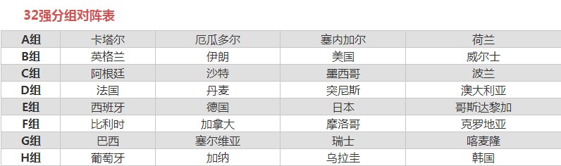 32支球队分为8个小组,每个小组4支球队,每支球队将会与同组的另外3支球队各进行一场比赛。其中90分钟比赛结束后,胜者得3分;平局各得1分;负者得0分,小组赛打完后每个小组积分最高的前两支球队晋级16强,积分三四名的球队将被淘汰出局。