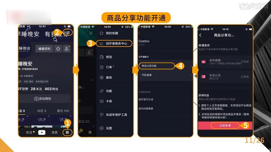 为助力商家线上转型,帮助新商家快速上手,抖音橱窗开通方式并不复杂,只需打开抖音APP,在【我】-【更多】-【创作者服务中心】-【商品橱窗】-【商品分享权限】里按照步骤操作就可以了。不过需要注意的是,开通之前还需满足几个条件。基础要求是需要申请人实名认证并准备500元商品分享保证金。进阶要求则需申请开通账户,个人主页有10条以上公开且审核通过的视频,同时,在不计算绑定第三方粉丝量的前提下,账号粉丝量至少达到1000。