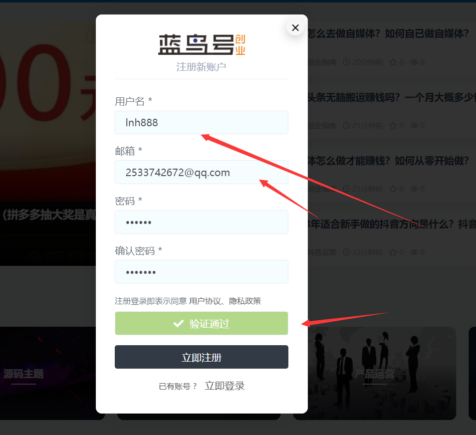 第三步:点击注册新用户后填写用户名,用户名以英文字母或+数字组成(需要注意的是,蓝鸟号只支持QQ邮箱、163邮箱、126邮箱等三种邮箱注册,其他的邮箱就不要浪费时间了)