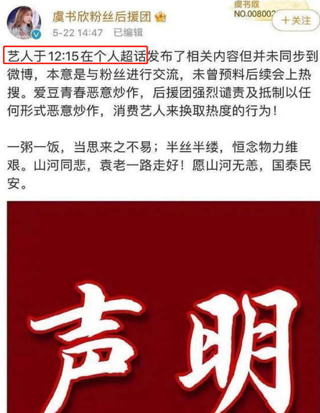 事后其工作室紧急道歉,表明只是虞书欣在超话里随口说的一句话,并未想到会上热搜。