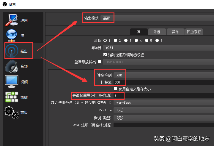 输出模式:高级 ;速率控制:ABR; 比特率:600~1000(根据网络是否顺畅、稳定来设置);关键帧间隔:2