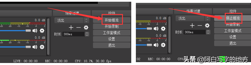 5、以上都设置好之后,点击OBS右下角“开始推流”即可开始直播,结束直播点击停止推流即可: